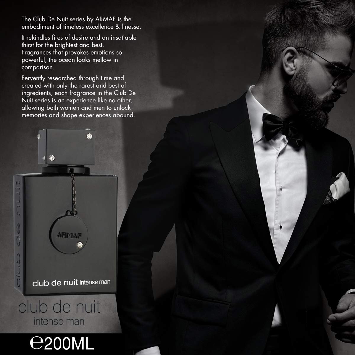 Club de nuit intense for man A provocative woody spicy masculine scent that opens with fresh fruity notes of lemon, apple and blackcurrant leading to an opulent floral heart of rose and jasmine spiced up with birch to add a smoky leather nuance. The base includes vanilla, ambergris, musk and patchouli.